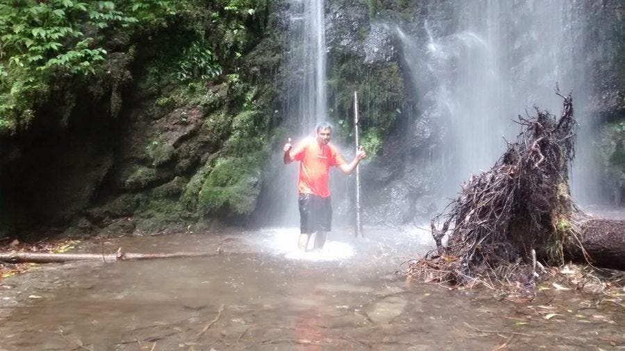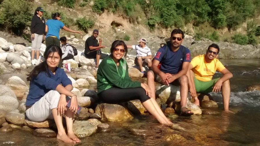 Bindu Ji and Tiwari Ji took us to a nearby waterfall. The view around the waterfall was great. It was quiet inside the jungle as there were only trees around and the path to reach the waterfall included crossing the streams over fallen trees. Only our group was there at the waterfalls, hence there was no other disturbance in the area and we enjoyed the whole scene. The guides advised not to go inside the waterfall as it is extremely cold water. Still, Dr. Pankaj had the dare to do this and he did it.