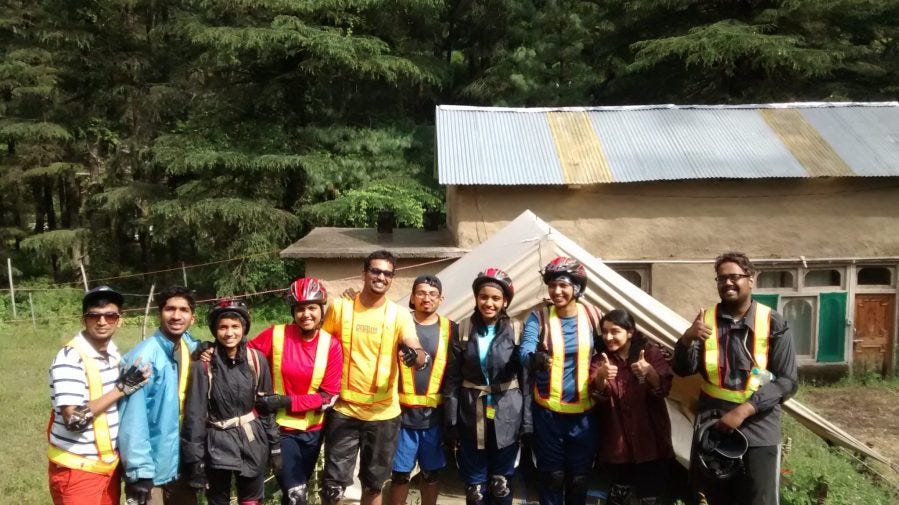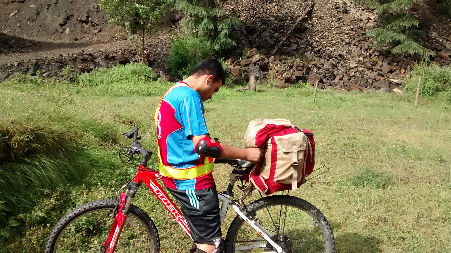 We had our wake-up call at 5.30 AM in the morning. We had our morning chores, followed by a yummy breakfast which included oats, and then we got ready to commence our expedition. We transferred our luggage bags to the Base camp store Room. We also packed our lunch which included parathas and dry vegetable sabji with pickles. I had my phone switched off to save battery, in case there was no electricity in higher camps. We were provided with a packet of snacks for the journey which included a ParleG packet, Frooti, and some chikki. We were then ready with our bicycles and the base camp leader hosted the green flag to signal us to march ahead. The next batch of participants were also there to wish us luck.