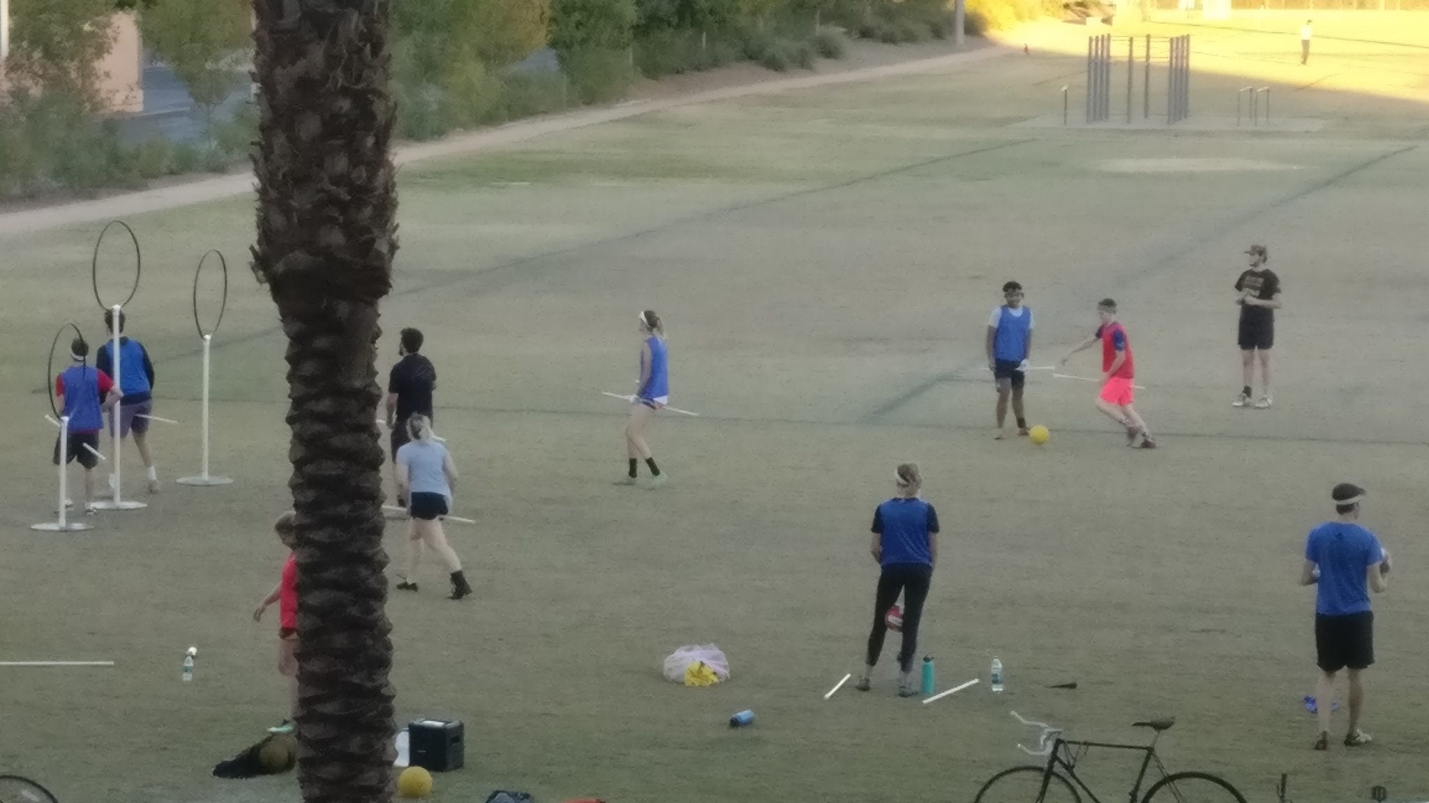 Frisbee is a fascinating game in the USA. It’s easy to learn but challenging to play. You pass the frisbee from one team member to another and try to reach the goal post. One catch, you can’t move when you have the frisbee. A pass is complete when your teammate successfully catches the frisbee without it touching the ground first, and if not, then the other team gets the frisbee. It gets cold (around 17-degree Celsius) after 07:00 PM. Some sports activities are the need to of the hour for a fit and healthy body. The SDFC Intramural Ground, which is next to the McCord Hall, is occupied with sports activities during the evening. People play cricket, Football(Soccer), and even Quidditch (Can’t believe, see the below proof).
