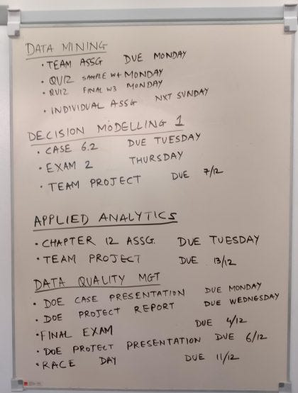 We desperately needed a Team Meeting (War room meeting) to discuss pending team items for submission. We listed out all the upcoming presentations and quizzes for the MSBA program. We then tacked the assignments one by one. We went home late that day (9:00 PM), and it was getting remarkably cold. It’s time to replace a sweater with a thick jacket, especially while cycling at night.