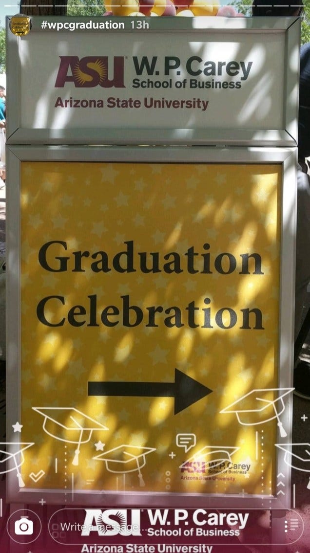 W.P.Carey organized the Graduation Celebration near the BAC building. There was a massive promotion for a free insulated water bottle, on filling the program survey. The event started at noon, and there was an enormous queue, almost 20 minutes in line to enter the event. And the water bottle was worth it. An insulated W.P.Carey Alumni branded 40oz water bottle with a lifetime warranty. By the time, I entered, the food was over, but still, freebies were available.