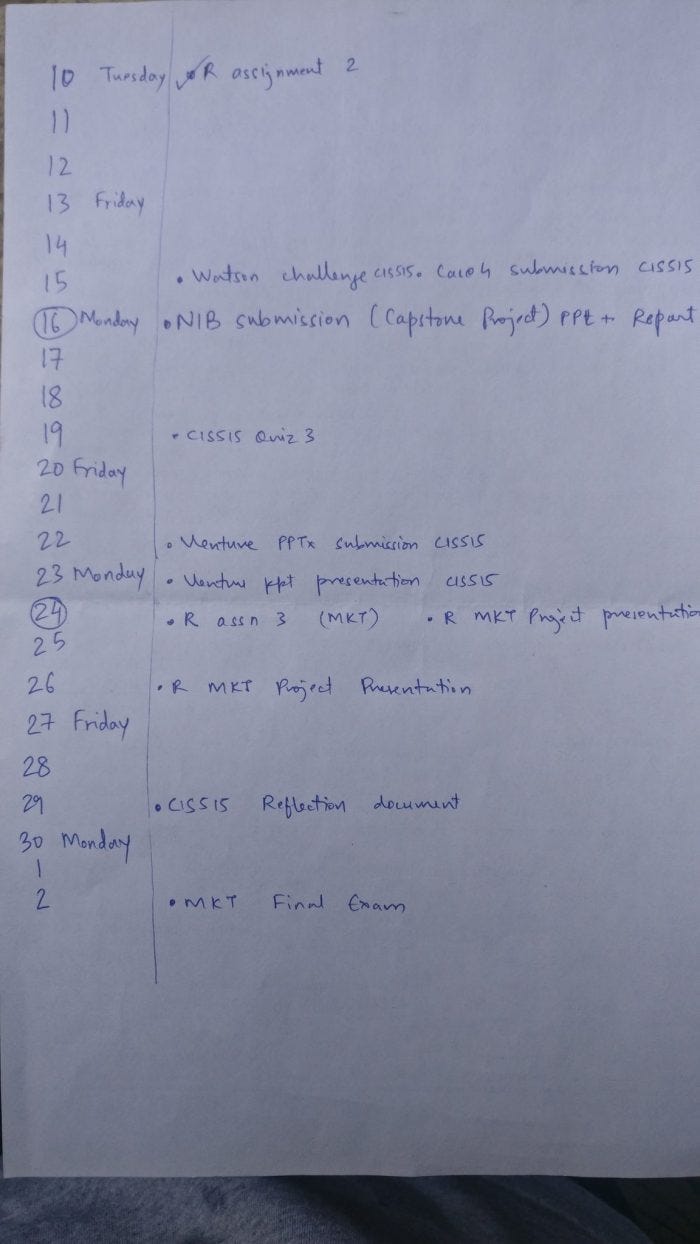 Four report submissions, three presentations, two quizzes and 1 Final Exam in the next three weeks, and then we are ready. Ready to set sail with flying colors, with a masters degree in our hand, and eager to change the world.